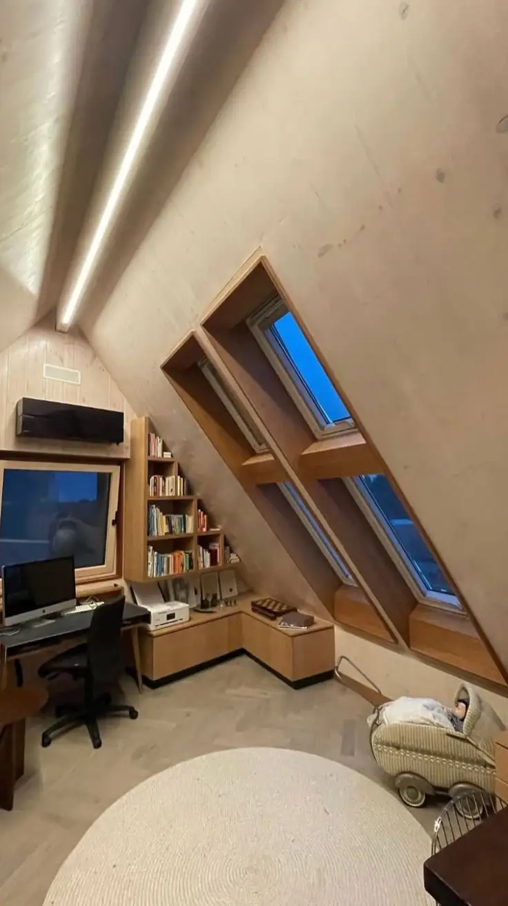 Clean lines, bold accents, and smart technology integration define modern attic office design. This style works especially well if your home already has contemporary elements.