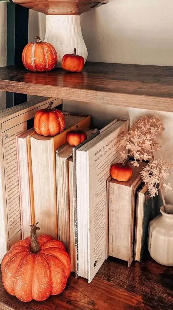 Use bookends shaped like leaves or acorns. Insert tiny twinkle lights between the rows or string a faux leaf garland along the top shelf. For extra warmth, tuck in amber colored glass bottles or repurposed jars filled with dried orange slices and cloves.