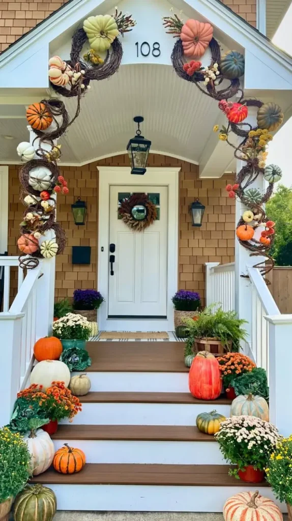 The front porch sets the tone for the entire home; it’s the very first thing guests see. Dressing it up with fall decor ideas makes a warm first impression. Layer a fall themed doormat over a larger jute rug for visual interest. Flank the door with tall corn stalks or rustic lanterns, then scatter a mix of gourds and mums around the steps.