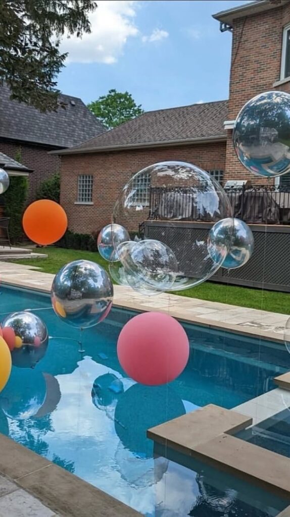 Adding ribbons beneath a few balloons creates soft, trailing lines that move with the water, adding depth and elegance. For evening gatherings, inserting tiny waterproof lights inside some balloons produces a glowing effect that reflects across the pool like scattered stars. This decoration works especially well for summer celebrations because it combines color, movement, and light in one simple feature.