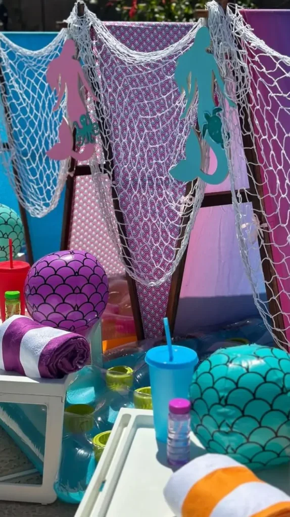 Color coordination plays a powerful role here. Repeating the same shades found in balloons, table settings, and inflatables ties the entire design together and creates visual harmony. This decorative layer not only fills empty vertical space but also frames the pool area beautifully, making the whole setting feel intentional, lively, and professionally styled.
