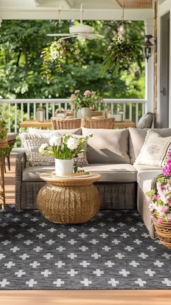 Rugs hide imperfections and add comfort underfoot, making the porch feel like an outdoor living room. Layer a smaller welcome mat for extra charm, blending textures for visual interest. Picture stepping onto a rug that pops with color, instantly lifting your mood.