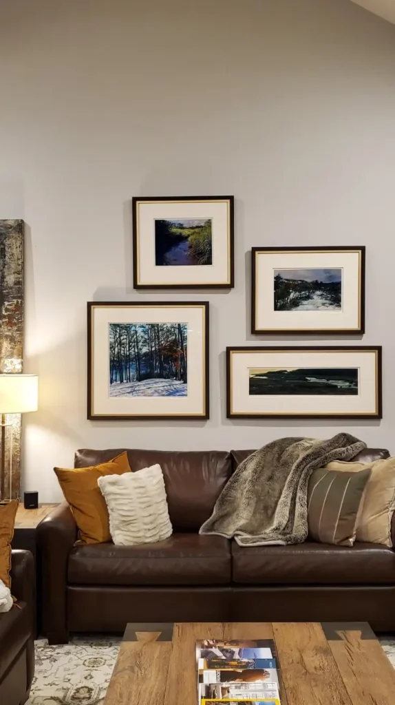 Nature-based prints, subtle abstract art, botanical illustrations, or gentle landscapes help the room feel connected to the season. Light backgrounds and airy compositions reflect sunlight instead of absorbing it. Frames in natural wood, white, or soft metallic finishes enhance this effect. Even changing the size or spacing of existing wall art can create a fresh rhythm.