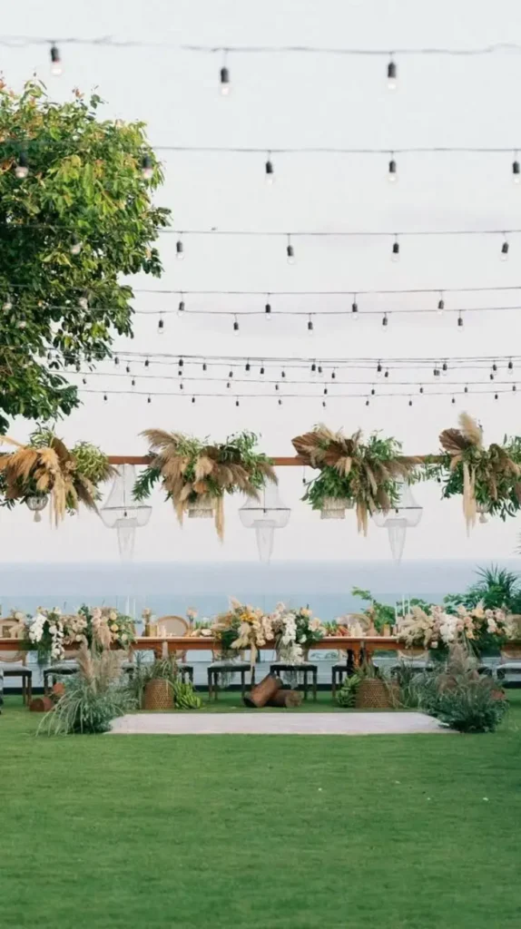 For free-spirited couples, bohemian wedding aisle decoration is the perfect fit. Rugs, dreamcatchers, pampas grass, and earthy tones create a relaxed and soulful atmosphere. Instead of flowers, brides can line the aisle with woven baskets, feathers, or dried blooms.