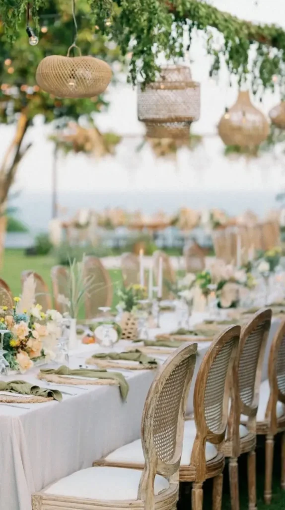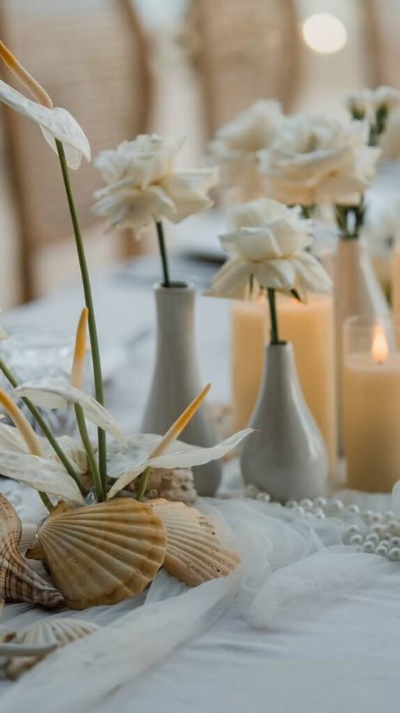 For beach weddings, seashell and sand decorations are the ultimate choice. Lining the aisle with shells, driftwood, or glass bottles filled with sand creates a coastal vibe that feels natural and romantic. Couples can even personalize the decorations with starfish, coral accents, or nautical ropes to reflect their seaside love story.