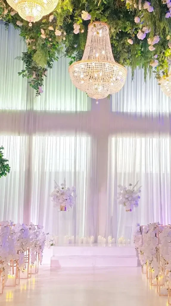 This style is perfect for grand venues, ballrooms, or evening weddings where the shimmer can truly shine. Paired with candles and flowers, crystal décor turns the ceremony into a romantic fantasy. Walking down an aisle lined with shimmering crystals makes the moment feel like a true Cinderella story.